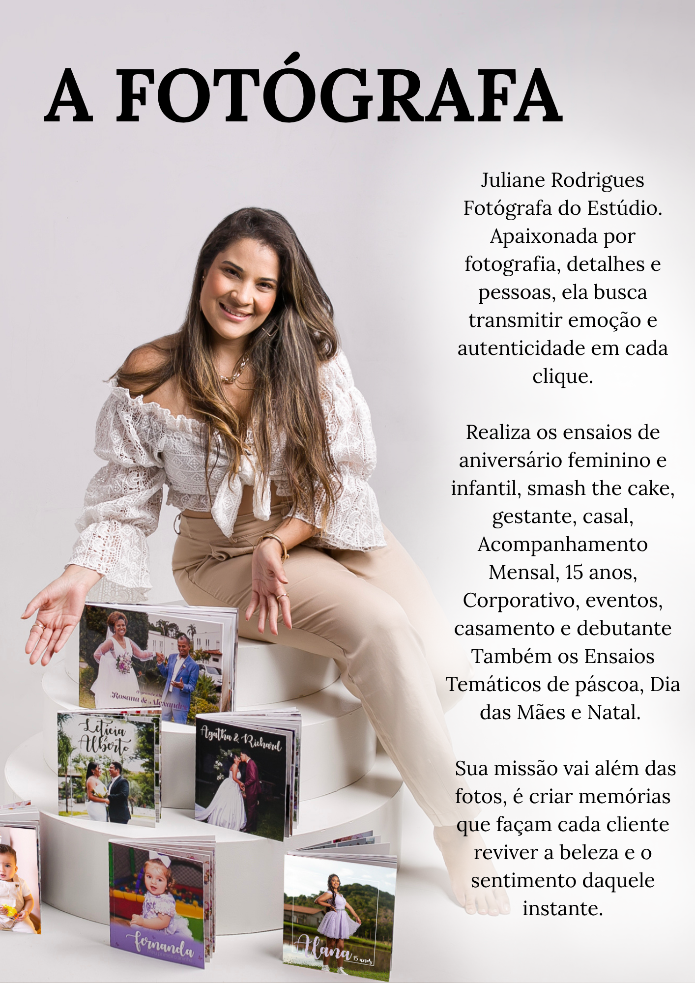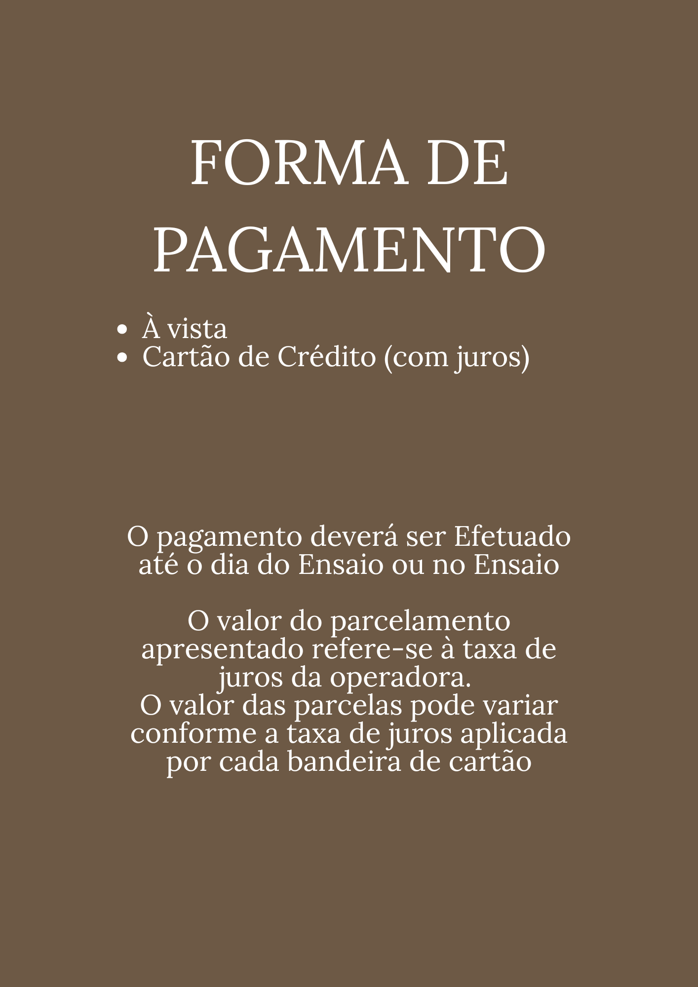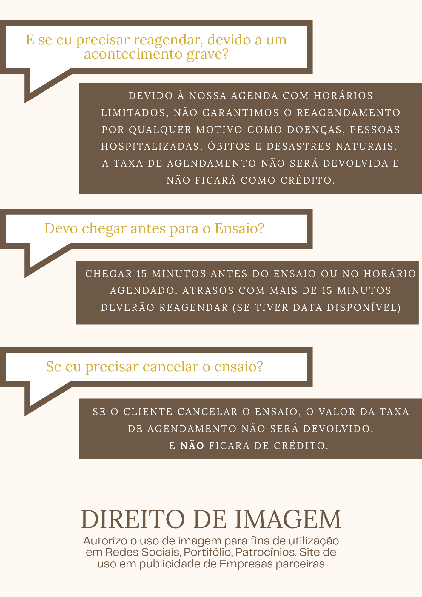 Venha pronta (make e cabelo), pois a fotógrafa não poderá ajudar, mas você pode adquirir e assim será destinado mais tempo ao seu ensaio para a produção