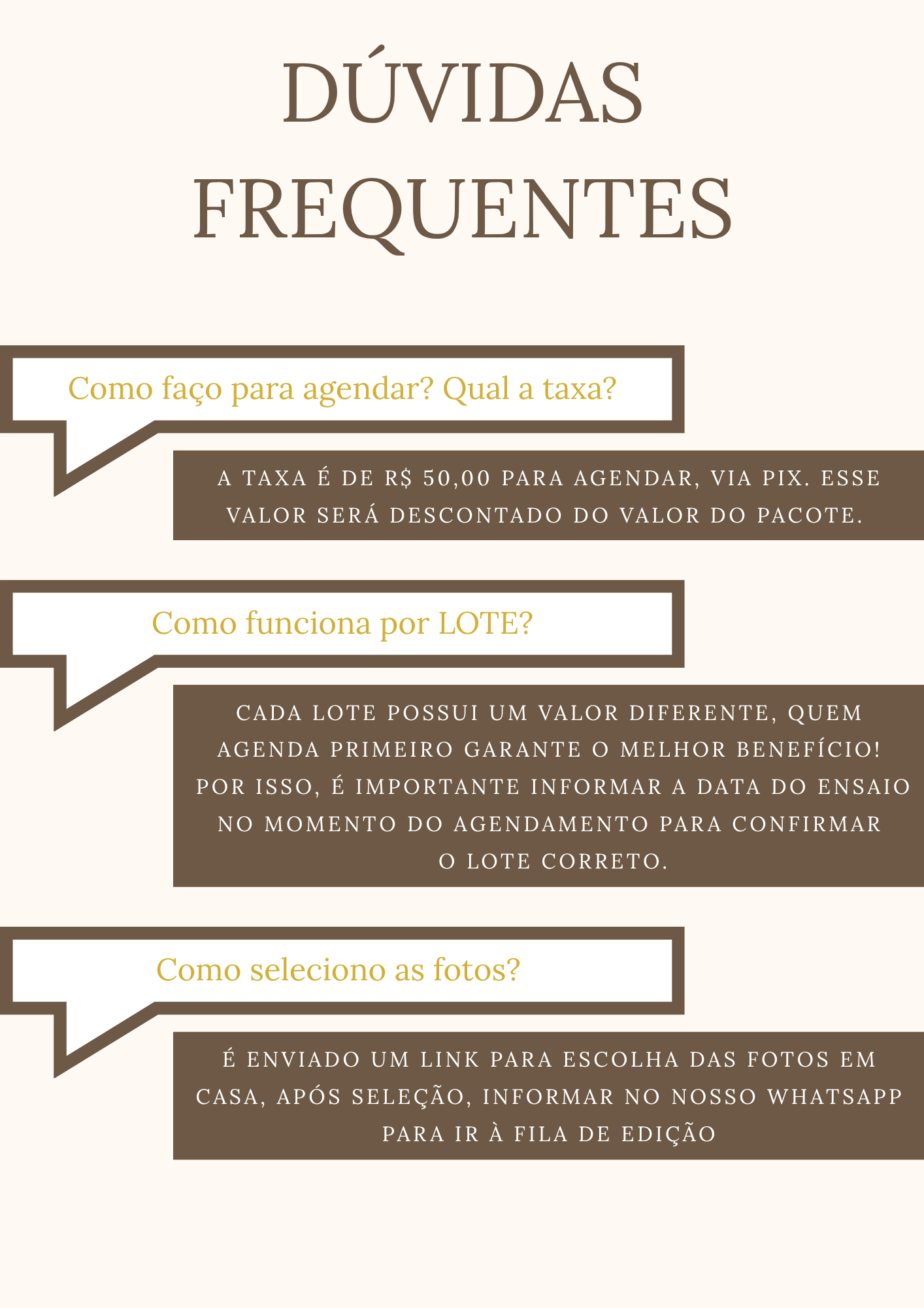PARA AGENDAR É SÓ INFORMAR PARA A FOTÓGRAFA SE PREFERE DIA DE SEMANA OU FIM DE SEMANA PARA QUE SEJA INFORMADO OS HORÁRIOS AINDA DISPONÍVEIS